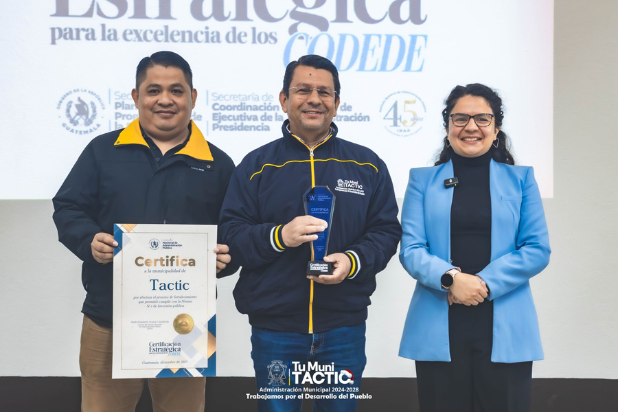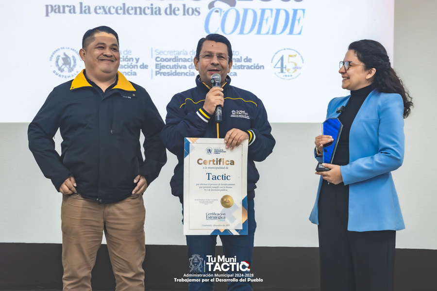 La Municipalidad de Tactic en esta Administración Municipal 2024-2028 recibió la «Certificación Estratégica a la Excelencia de los Codedes», el cual es otorgado por el Instituto Nacional de Administración Pública –INAP– a las comunas que mejoraron significativamente sus procesos de planificación y gestión de proyectos para el 2026.